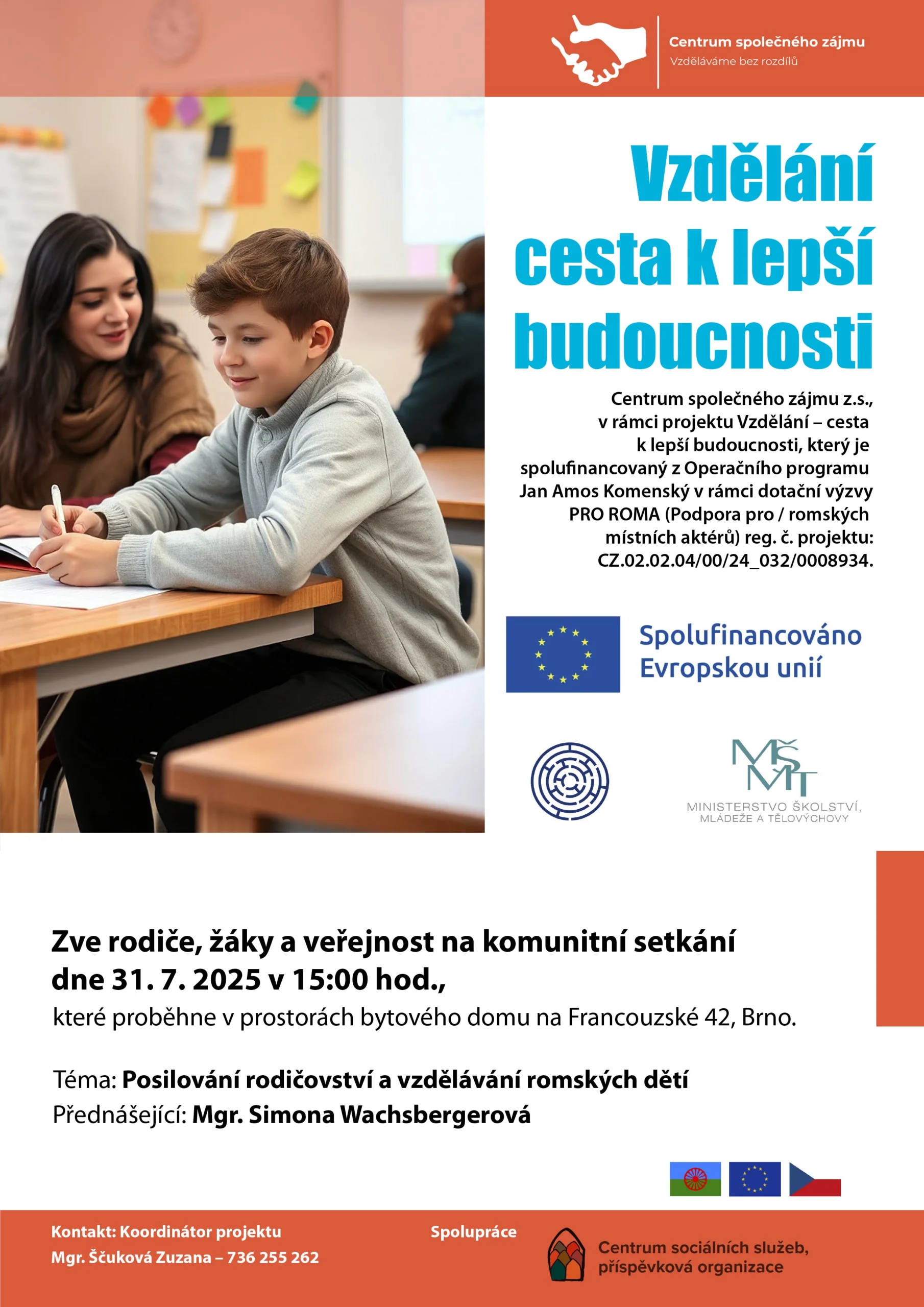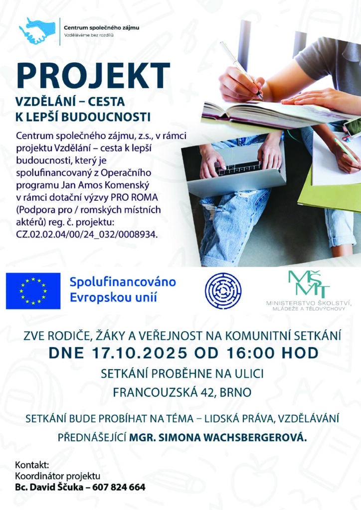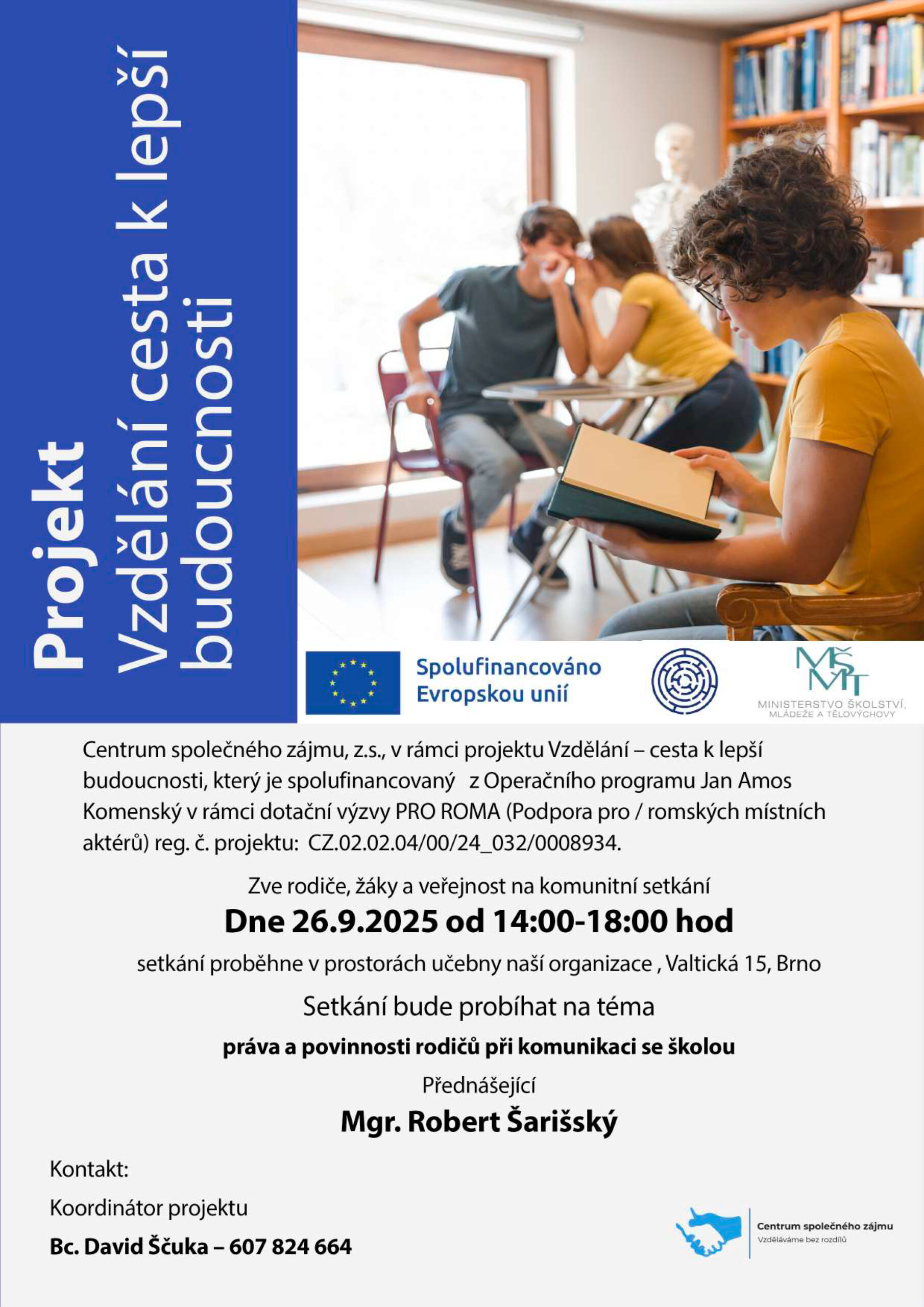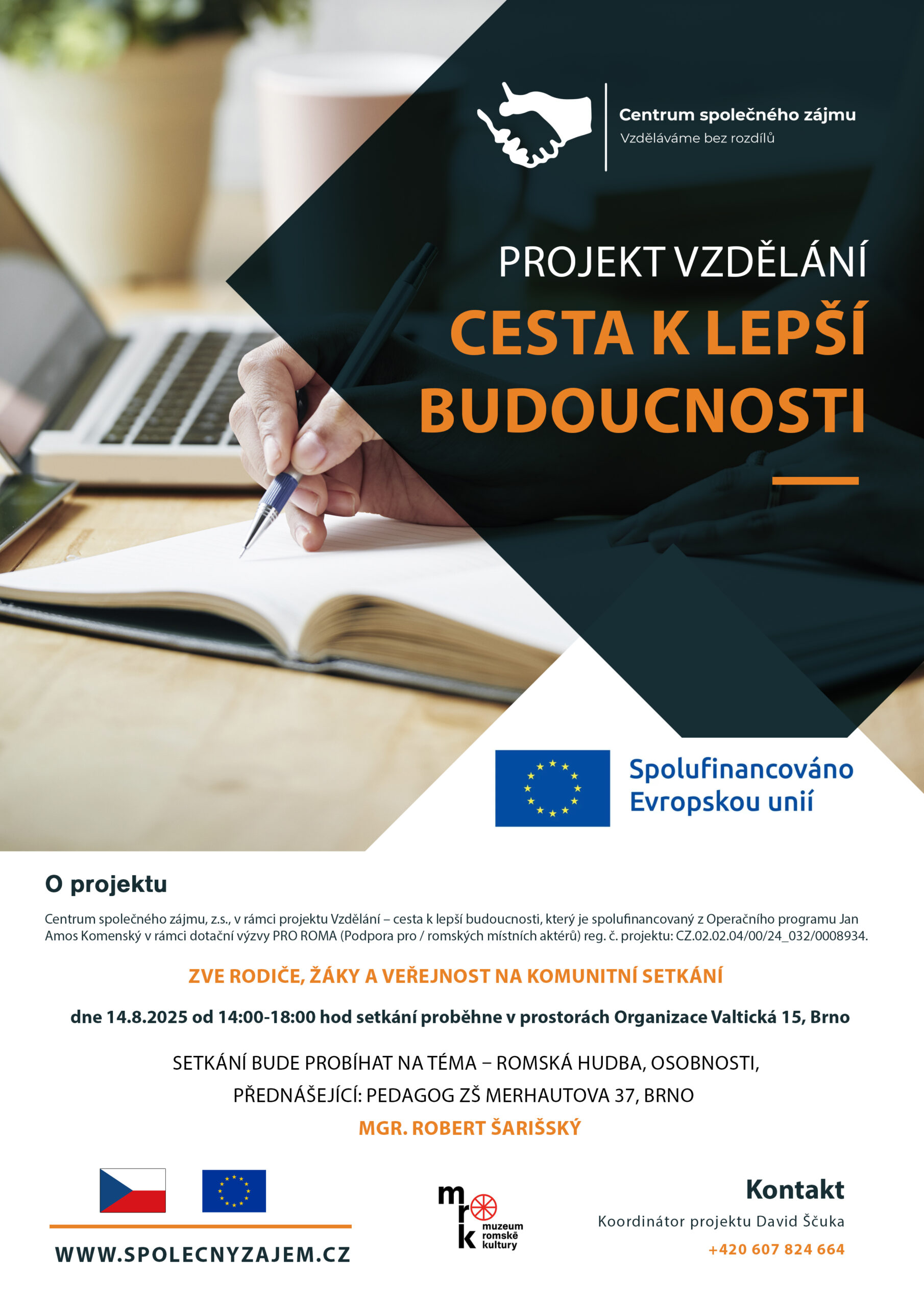 Centrum společného zajmu, z.s., v rámci projektu Vzdělaní – cesta k lepší budoucnosti, který je spolufinancovaný z Operačního programu Jan Amos Komenský v rámci dotační výzvy PRO ROMA Podpora pro / romských místních aktérů) reg. č. projektu: