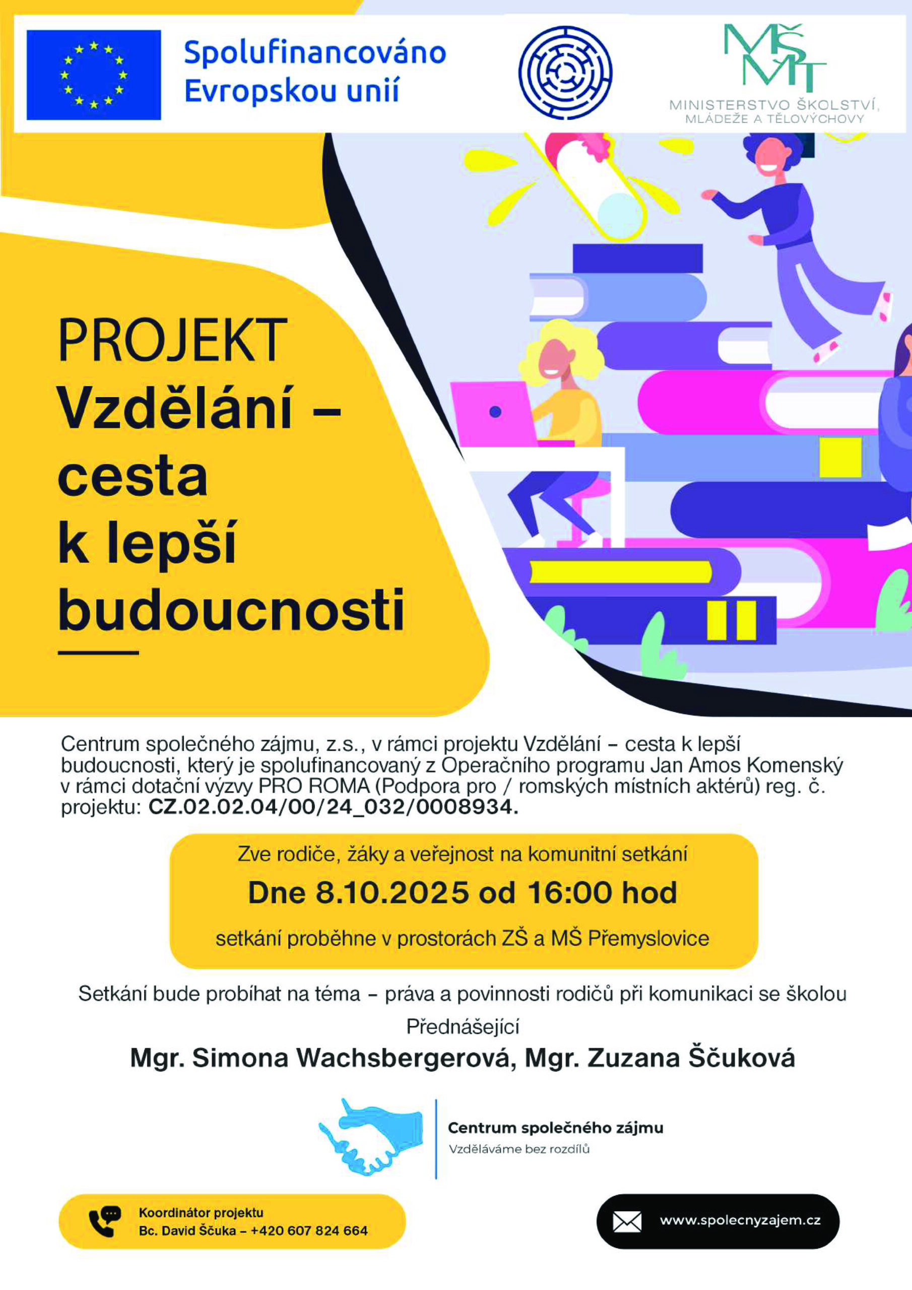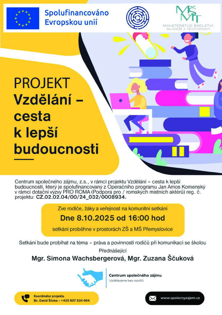 Zve rodiče, žáky a veřejnost na komunitní setkání dne 8.10.2025 od 16:00 hod. Setkání proběhne v prostorách ZŠ a MŠ Přemyslovice